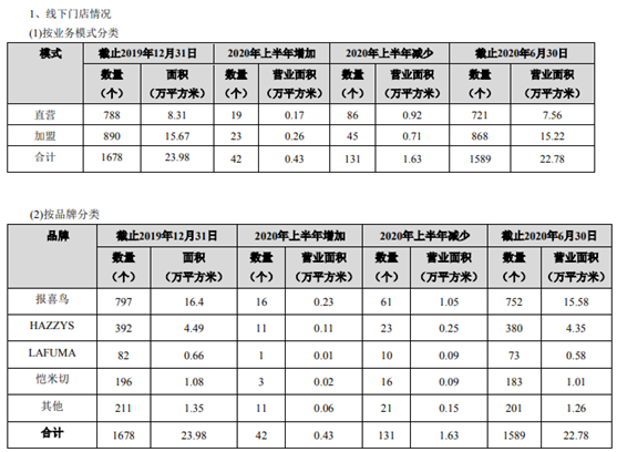 目前,服裝消費市場環境已經發生了根本性的變革。電商渠道已經成為核心商業變量的重要因素之一。公告顯示,報喜鳥線下銷售渠道在今年上半年呈縮減的趨勢。2020年上半年直營店減少67個,加盟店減少22個。其中報喜鳥品牌線下店數量最多,減少的也最多。