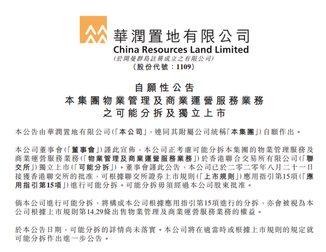 公告顯示,華潤置地正考慮可能分拆本集團的物業管理服務及商業運營服務業務於香港聯合交易所有限公司獨立上市。董事會謹此公告,本公司已於2020年8月21日接獲香港聯交所的批准,可根據聯交所證券上市規則應用指引第15項進行可能分拆。可能分拆毋須經過本公司股東批准。