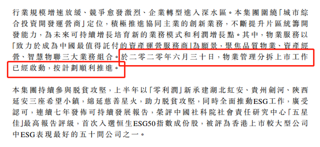 其中,物業服務以“致力於成為中國最值得託付的資產運營服務商”為願景,聚焦品質物業、資產經營、智慧物聯三大業務組合。於2020年6月30日,物業管理分拆上市工作已經啓動,按計劃順利推進。