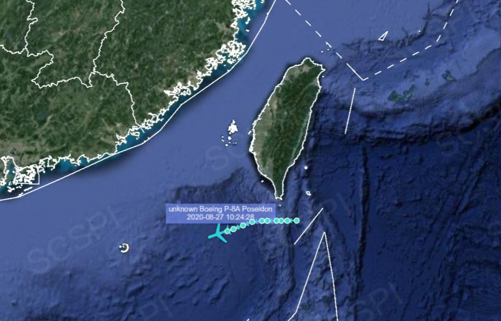 據“南海戰略態勢感知”計劃平台8月27日發佈的消息,當天上午10點20分左右,一架美國海軍的P-8A反潛巡邏機途徑巴士海峽前往南海開展偵察行動。