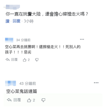 作出上述言行的蔡英文及民進黨當局,如今卻宣稱擔心區域“擦槍走火”,有島內網民怒稱,你一直在挑釁大陸還會擔心擦槍走火嗎?“鬼話連篇”↓