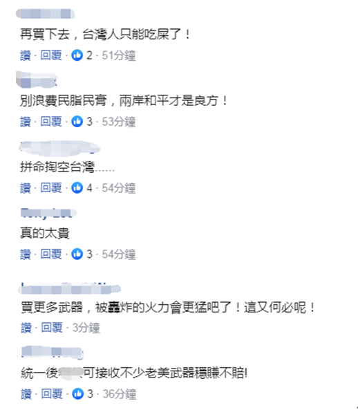 對此,有島內網民在評論區怒斥民進黨當局,拼命掏空台灣,有人大呼:別浪費民脂民膏,兩岸和平才是良方!↓