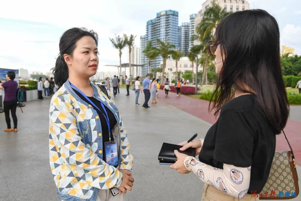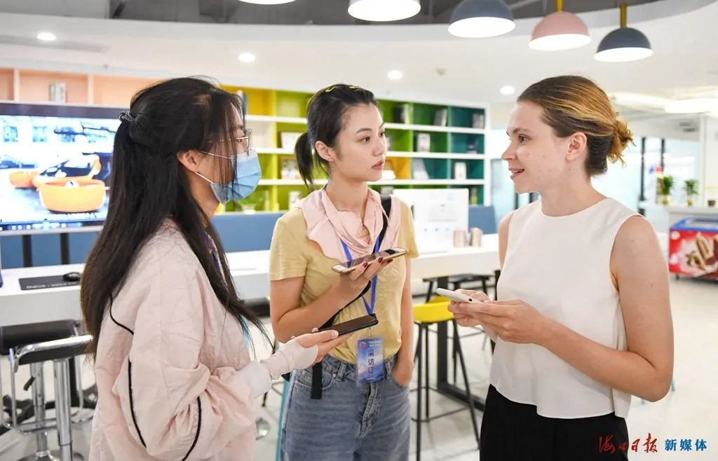 採訪團成員在海口復興城採訪外籍員工。海口日報記者 王程龍 攝