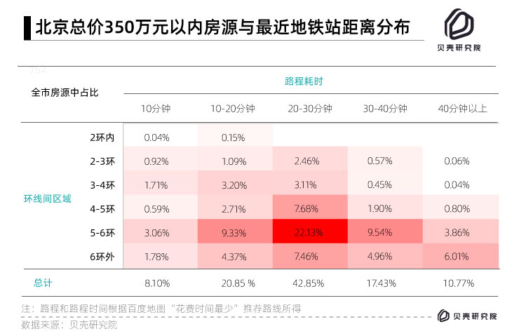 對於上班族而言,出行便利、職住通勤距離是必須要考慮的因素。據貝殼研究院計算的總價350萬以內所有房源到其最近地鐵站的路程和所需時間,僅10.8%的房源距離最近地鐵站的路程在1公里以內,28.95%的房源距離最近地鐵站路程耗時在20分鐘以內。