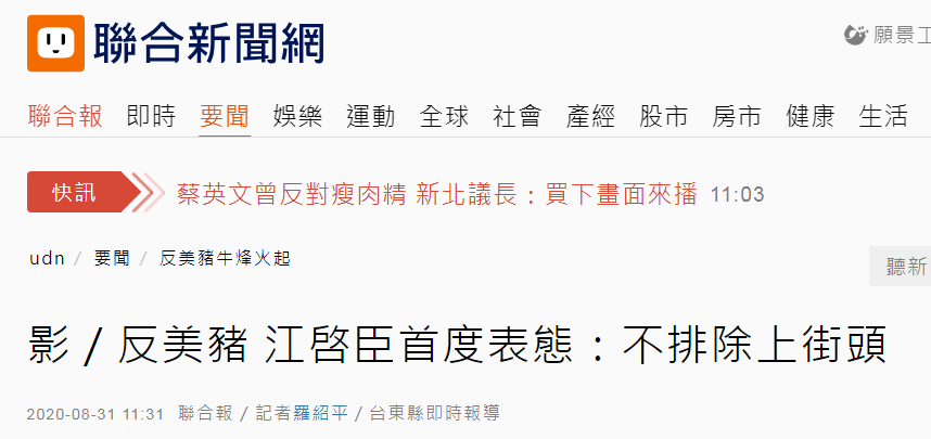 據台灣“聯合新聞網”、“中央社”報道,國民黨今天(31日)上午10點動員22個縣市議會黨團同步舉行“拒絕瘦肉精豬肉,捍衞全民健康”記者會,江啓臣在台東縣議會主持記者會,他接受媒體聯訪時對於反制美豬進口有無其他具體措施的提問,作了上述表示。