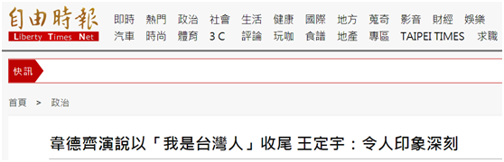 據島內親綠的《自由時報》報道,維斯特奇爾今天(1日)在台演説時效仿美國前總統肯尼迪那句知名的“我是柏林人”,在其演説中他以中文説出“我是台灣人”作結尾,《自由時報》稱“現場立刻響起如雷掌聲”云云,“綠委”王定宇更是在臉書嗨稱:“這是一次‘令人印象深刻的演講收尾’”。↓