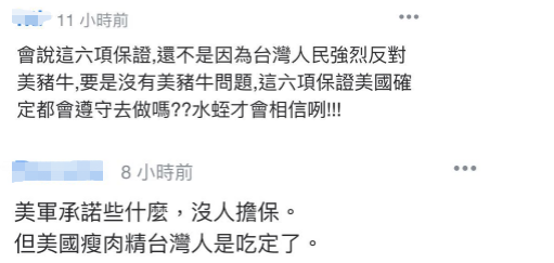 還有島內網民諷刺,會説“六項保證”還不是因為台灣民眾強烈反對美豬牛。美國承諾些什麼沒人擔保,但美國瘦肉精台灣人吃定了。↓
