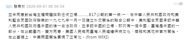 也有網民注意到“六項保證”中包括一項“未改變關於台灣主權的立場”,該網民提到1979年《中美建交公報》稱,美國在該公報中承認“中華人民共和國政府是中國的唯一合法政府”,“只有一箇中國,台灣是中國的一部分”等內容。↓