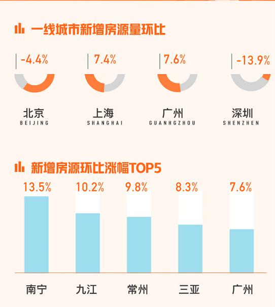 市場供應方面,報告顯示全國新增掛牌房源量環比下跌4.8%。一線城市北京和深圳出現一定程度的環比下跌情況,其中深圳新增掛牌房源量環比下降最為明顯,為-13.9%;上海和廣州新增掛牌房源量環比上漲均超過7%。從全國範圍來看,南寧、九江、常州、三亞和廣東環比上漲形勢備受矚目,其中南寧以13.5%的環比漲幅排名最高。