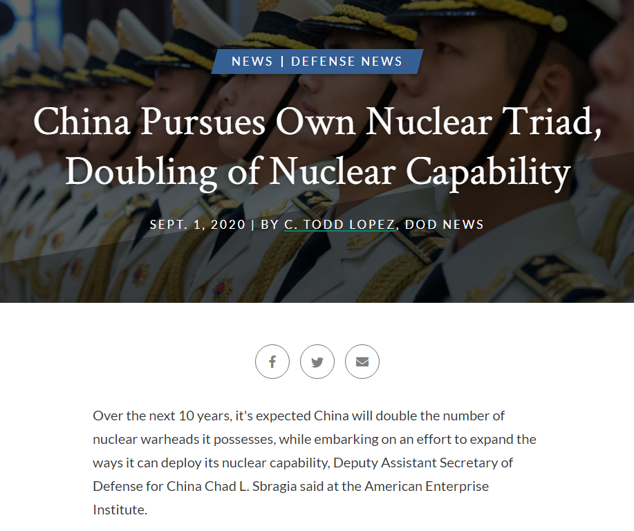 美國國防部網站9月1日也對《2020中國軍力與安全發展報告》進行了解讀。美國國防部副助理部長查德·斯布拉基亞當天在美國企業研究所説,預計在未來10年,中國將把其擁有的核彈頭數量增加一倍,同時開始努力擴大核能力的部署方式。