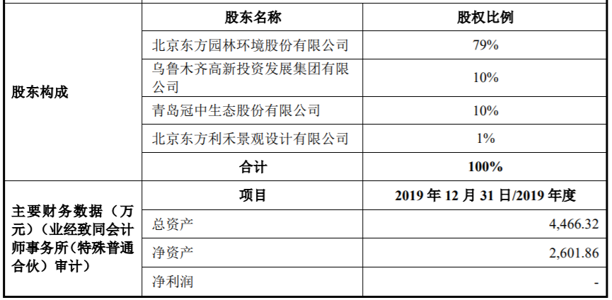 根據本次IPO發佈的招股書披露,冠中生態在2017年7月與東方園林、烏魯木齊創新投、北京東方利禾景觀設計有限公司聯合組建了“烏魯木齊東園眾成建設工程有限公司”和“烏魯木齊東園新冠建設工程有限公司”兩家項目公司,對比兩家項目公司的實收資本和淨資產,這兩個項目公司目前還暫未有收入、利潤數據。