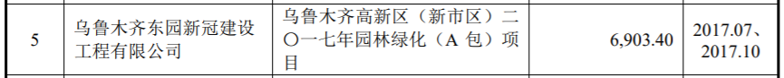 冠中生態此前曾是新三板掛牌公司,於2015年11月在新三板掛牌交易,後於2017年5月終止掛牌。在終止掛牌前夕的2017年4月20日,連續發佈了兩項《關於重大項目中標公告》,其中披露:公司和北京東方利禾景觀設計有限公司作為成員單位,與牽頭人北京東方園林環境股份有限公司為烏魯木齊高新區(新市區)2017年園林綠化(A包、D包)PPP項目的中標單位,涉及金額分別為25387.74萬元和36027.75萬元。