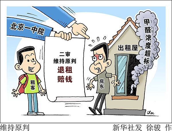 新華社北京9月1日電(吳文詡、李正)入住出租房兩天就出現頭疼、噁心等症狀,經過檢測發現,房屋內甲醛濃度嚴重超標……近日,北京市第一中級人民法院就一起房屋租賃糾紛案件二審維持原判,支持原告王某關於解除合同、退還租金和押金、支付違約金等訴訟請求。