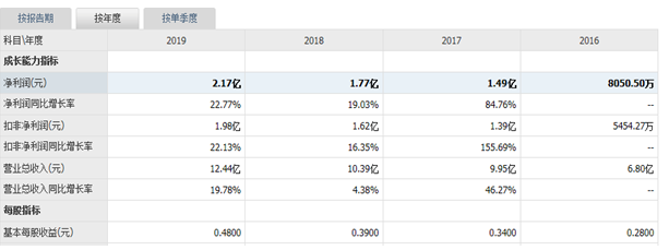 近幾年威勝信息業績持續穩定增長,各項指標領先同行。2016-2019年,營業收入分別為6.80、9.95、10.39和12.44億元,近三年複合增速22.29%;歸母淨利潤分別為0.81、1.49、1.77和2.17億元,近三年複合增速39.25%。如下圖1:
