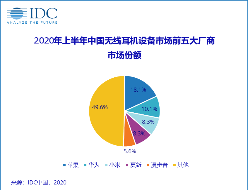 按廠商來看,上半年,蘋果佔據無線耳機設備市場18.1%的份額,華為市場佔有率達到10.1%。此外,小米和夏新市場份額均為8.3%,漫步者市場佔有率為5.6%。