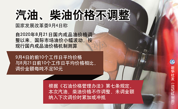 國家發展改革委有關負責人説,自2020年8月21日國內成品油價格調整以來,國際市場油價小幅波動,按現行國內成品油價格機制測算,9月4日的前10個工作日平均價格與8月21日前10個工作日平均價格相比,調價金額每噸不足50元。根據《石油價格管理辦法》第七條規定,本次汽油、柴油價格不作調整,未調金額納入下次調價時累加或衝抵。