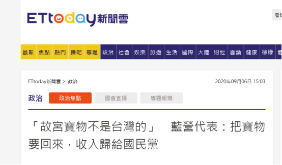 【環球網報道 記者 王心怡】“台北故宮裏的國寶不是台灣的,是國民黨帶來的。”據台灣東森新聞網報道,9月6日,因不滿國民黨“黨產”被民進黨當局凍結,國民黨代表陳麗旭在國民黨代表大會上提議,台北故宮門票收入應歸國民黨所有,如此國民黨就有收入來源了。值得注意的是,陳麗旭做出這番表態之際,國民黨方面日前稱,現在黨部財務拮据,累積負債高達2.7億元(新台幣,下同),而由於財產被扣,實際可用資產僅有6億元,現金在8月就已用光。