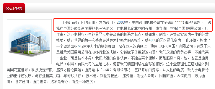 值得關注的是,不論是通用電梯前身“通用電梯(中國)有限公司”,還是代為出資的外資機構“美國通用”,名稱是都與國際著名大型企業美國通用集團具有極大相似性;甚至在通用電梯自行設立的網站上,在公司介紹中也隱晦地描述道:“2003年,美國通用電梯公司在全球新****戰略的思想下,選擇在中國經濟高速發展的長三角地區,在電梯名企林立的蘇州,成立通用電梯(中國)有限公司”。