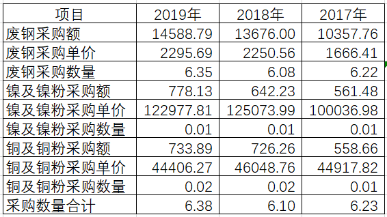 再來看其他經營數據,根據招股書披露,屹通新材的核心業務是將採購來的廢鋼、鎳塊、銅塊等加工成粉末,因此該公司的產品產量,與前述原材料的採購數量之間存在緊密關係。