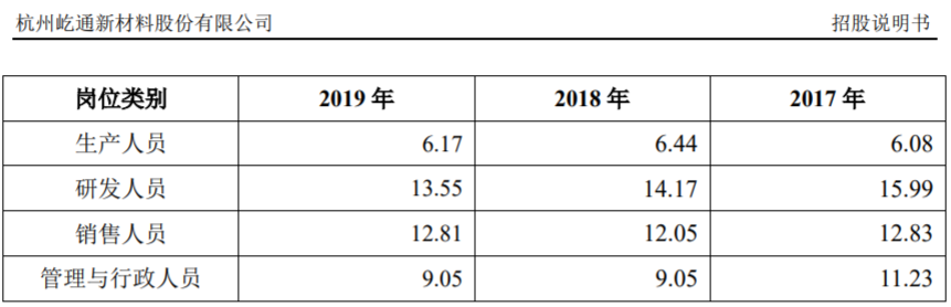 此外,根據招股書披露,屹通新材的生產人員、研發人員的人均薪酬在2019年均出現了同比下降,研發人員的人均薪酬更是在2018年和2019年兩連降;管理與行政人員薪酬則在2018年出現了大幅下滑、降幅高達20%左右。請問這是否合理?以生產人員人均薪酬為例,2019僅為5千元/月,這還是包含了由企業承擔的社保和住房公積金的成本,若剔除後工人實際工資將更低。對此,屹通新材則表示,發行人員工平均收入水平有所下降主要系新入職人員薪酬相對較低所致。
