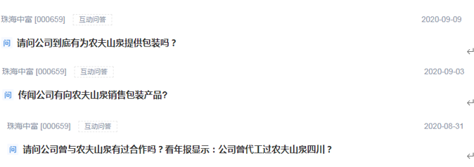 誠然,根據農夫山泉的招股書,包裝飲用水的近60%的毛利率確實也撥動了市場的“神經”,互動易平台投資者對於自己關注的相關企業,最愛的發問就是:“請問農夫山泉是公司的客户嗎?”