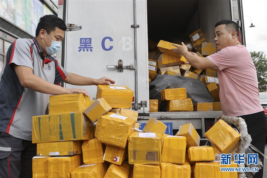 9月9日,快遞員在位於中國(黑龍江)自由貿易試驗區綏芬河片區的伊戈爾大市場外接收準備發往各地的俄羅斯貨品。 新華社發(張濤攝)
