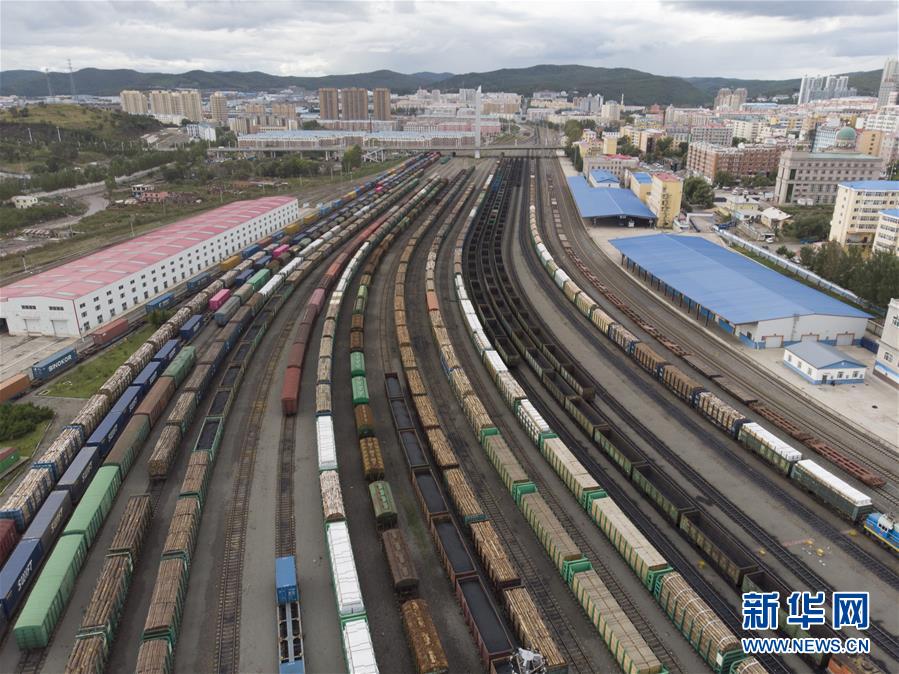 9月9日拍攝的綏芬河火車站北場裝滿物資的貨運車廂(無人機照片)。 新華社發(張濤攝)