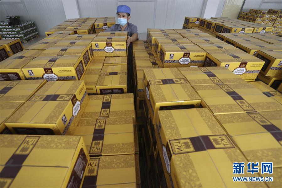 9月9日,工人在綏芬河三顆麥麪條生產車間裏搬運準備出口俄羅斯的產品。 新華社發(張濤攝)