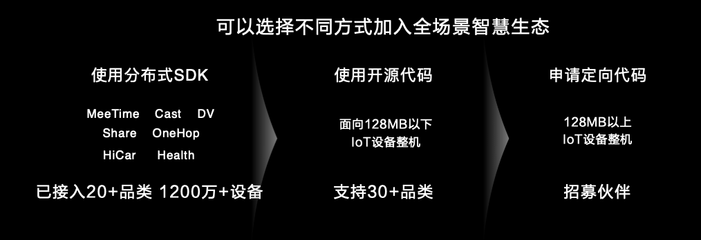 面對廣大的硬件設備廠商,HarmonyOS 通過SDK、源代碼、開發板/模組和HUAWEI DevEco等裝備共同構成了完備的開發平台與工具鏈,讓HarmonyOS設備開發易如反掌。設備廠商可以選擇不同的方式加入全場景智慧生態:通過使用分佈式SDK,已經有1200萬+設備,獲得暢連、HiCar等7大能力快速接入;此次發佈會後,30+品類的128MB以下IoT設備整機也可以使用開源代碼接入;對於128MB以上、4GB以下的智能設備整機,HarmonyOS已經通過申請定向代碼開始招募夥伴加入。