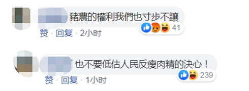 蔡英文日前宣佈開放含瘦肉精美國豬肉進口在島內引起軒然大波,有島內網友于是留言稱,“豬農的權利我們也寸步不讓”“也不要低估人民反瘦肉精的決心”。↓