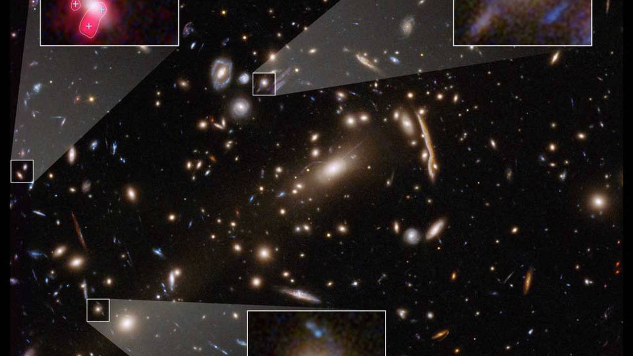 引力透鏡是一種有趣的現象,它能使遙遠的背景物體發生扭曲,就像一面有趣的鏡子。這種扭曲有時會產生同一個遙遠星系的多重圖像。一個星團中暗物質的濃度越高,光的彎曲就越引人注目。上圖顯示的是幾十個多重成像的透鏡背景星系。