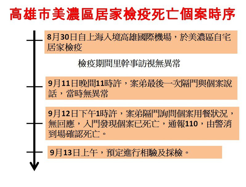 據台灣“聯合新聞網”“中央社”等台媒報道,高雄美濃一名50多歲女子居家檢疫期間猝死,據瞭解,這名女子8月30日自上海飛抵小港機場入境,平時在北部與母親、哥哥及兩名妹妹同住。這次因工作關係前往南京,但返台時北部住家空間不足,無法執行居家檢疫,因此暫留美濃弟弟家執行居家檢疫14天到9月13日解除。但12日她被家人發現在住所死亡,一度被懷疑感染新冠病毒。