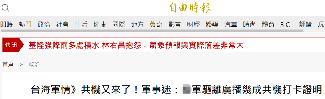 《自由時報》報道稱,大陸9日、10日連續兩日派出多架次蘇-30、殲-10戰機進入台西南空域後,今天(13日)上午解放軍戰機再次進入台西南空域,報道老調重彈宣稱“軍方仍以廣播方式驅離”,還稱“看得出來中國(大陸)毫不在乎台灣‘國防部’的記者會,把西南空域當自家後院”。