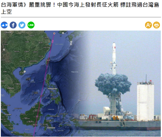 而在此次發射前後,就有不少台灣媒體在炒作大陸發射火箭特地標註“從台灣上空飛過”的話題。