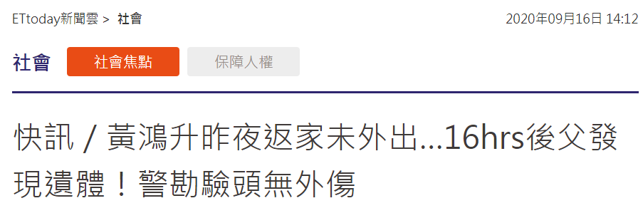 台灣ETtoday新聞雲稱,經台灣警方初步瞭解,黃鴻升倒卧在浴室門口,洗澡水已經放好,上衣穿着完整,但褲子已經半脱,且口鼻冒血,今天11時27分其父走入家中時才發現黃鴻升已經身亡。