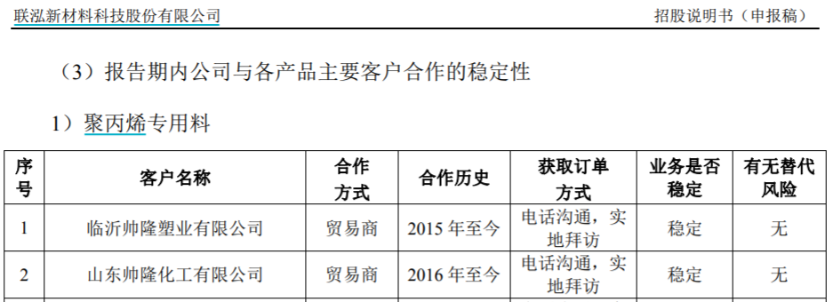 值得關注的是,在行業整體面臨產能過剩,但公司自身卻產銷兩旺、營業額逐年增加的背後,根據招股書披露的銷售數據顯示,聯泓新材的核心產品聚丙烯專用料的前五大銷售客户,全部都是在2017年及以後年度建立的合作關係,同時其他產品的大客户也以2017年及以後年度建立合作關係的客户為主。