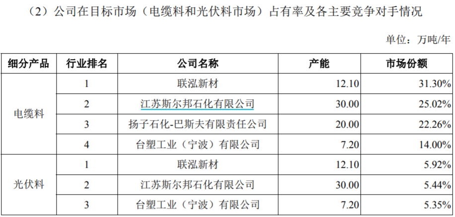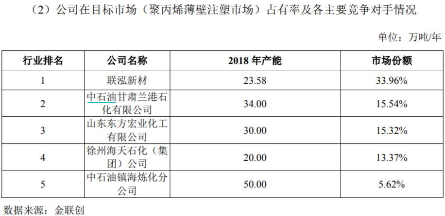 與此同時,招股書披露的數據還顯示,聯泓新材的產能利用率顯著超過了同行業其他公司。以聚丙烯薄壁注塑產品為例,聯泓新材的產能遠低於中石油甘肅蘭港石化有限公司,但是聯泓新材的市場份額卻是後者的兩倍以上;相較於其他主要競爭對手,也存在同樣的數據表現。這就意味着,在聯泓新材產銷兩旺、維持着很高的產能利用率的同時,其他主要競爭對手的產能利用率卻尚不足50%。對於主業景氣度顯著高於同業的現象,聯泓新材在招股書中並未能給出有足夠説服力的解釋。
