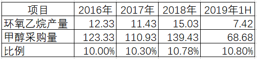 此外,根據招股書披露,聯泓新材的核心原材料是甲醇,用甲醇加工成環氧乙烷後,或對外銷售、或再與其他化工原材料結合加工成其他產品,招股書第179頁披露了環氧乙烷的各年度產量,對比招股書披露的甲醇採購量,可以發現利用甲醇生產環氧乙烷的生產率在逐年提高。對此,聯泓新材並未給出解釋,也未接受記者採訪。