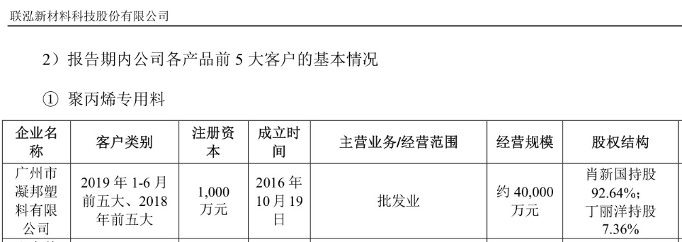 在這些合作期限並不長的重要客户中,包括“廣州市凝邦塑料有限公司”註冊成立於2016年10月,2017年與聯泓新材建立銷售關係,2018年即成為聯泓新材第三大客户、經銷金額逾3億元。根據工商資料顯示,在與聯泓新材建立合作關係的2017年年末,這家公司的實繳資本為零、員工社保繳納人數僅為4人;在為聯泓新材經銷了逾3億元聚丙烯專用料的2018年,該公司的員工社保繳納人數也不過才14人。