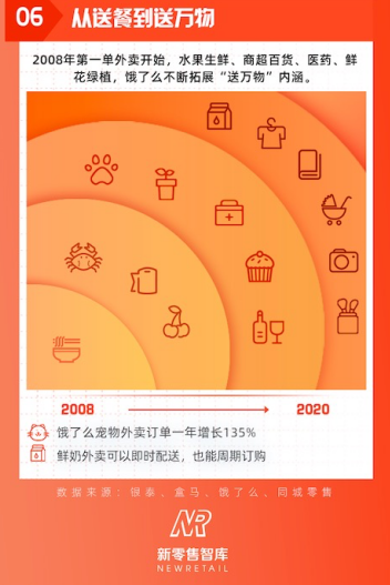疫情以來,入駐餓了麼的整體商家數增長了30%,但非餐飲的門店數量增速遠超大盤,其中,寵物用品店數量增長了6倍、火鍋烤串食材店和母嬰店的數量也都增長超3倍。過去一年,餓了麼寵物外賣訂單增長135%。