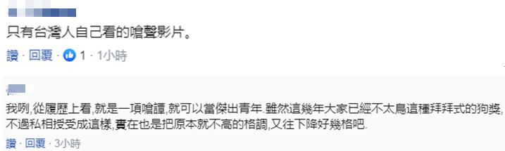 也有網友表示,“只有台灣人自己看的嗆聲影片”“雖然這幾年大家已經不太鳥這種拜拜式的狗獎,不過私相授受成這樣,實在也是把原本就不高的格調,又往下降好幾格吧。”