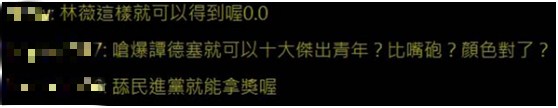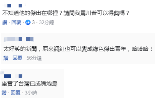 還有網友在台媒評論區留言稱,“不知道她的傑出在哪裏”“原來網紅也可以變成綠色傑出青年”“坐實了台灣已成嘴炮島”。
