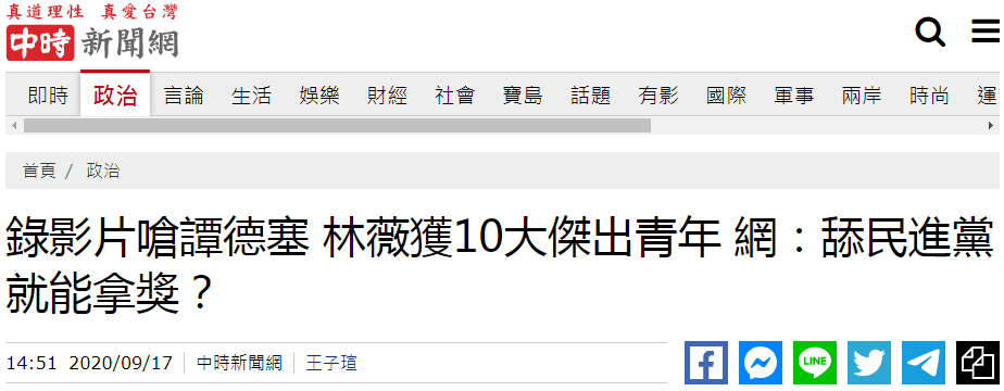 【環球網報道 記者 尹豔輝】據台灣中時新聞網等台媒9月17日報道,“國際青年商會台灣地區總會”9月17日公佈第58屆十大傑出青年得獎名單,共有12人獲獎,值得注意的是,曾在4月錄製視頻“嗆聲”世界衞生組長總幹事譚德塞的留英台灣學生林薇獲獎。林薇獲獎消息讓不少島內網友吃驚,認為理由難以説服人,更留言諷刺:“舔民進黨就能拿獎喔。”