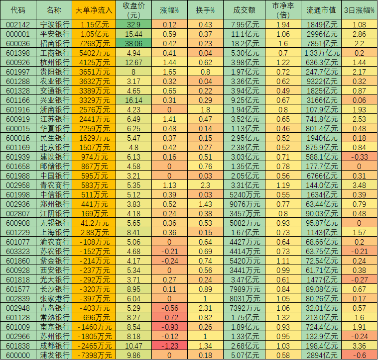 具體來看,36只交易的銀行股中,有23只呈大單資金淨流入,佔比63.89%,其中,包括寧波銀行(1.15億元)、平安銀行(1.05億元)、招商銀行(7268萬元)等在內的14只個股淨流入額均超1000萬元,合計淨流入6.32億元。