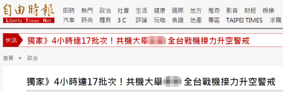 島內親綠的《自由時報》報道稱,解放軍軍機今天(18日)早上連續出現在台灣西南、西部、北部及西北空域,台防務部門累計已連發24次廣播“驅離”,從上午7點至11點,“空軍”全台各基地各型戰機更罕見緊急起飛達17次之多。