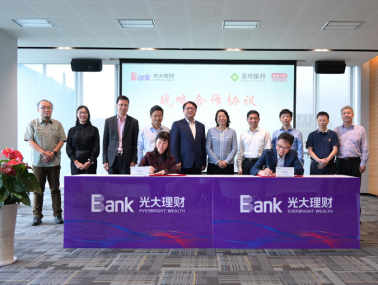 8月26日,光大理財有限責任公司(以下簡稱“光大理財”)與蘇州銀行股份有限公司(以下簡稱“蘇州銀行”)在青島舉行會談並簽署戰略合作協議。光大銀行首席業務總監、光大理財董事長張旭陽,監事長王琳、副總經理酈明、首席投資官戴京焦、首席技術官張軼,蘇州銀行董事長王蘭鳳、監事長楊建清、副行長王強、副行長張小玉、董事會秘書李偉見證簽約,光大銀行資產管理部總經理、光大理財總經理潘東和蘇州銀行行長趙琨代表簽約。