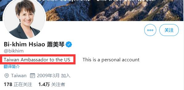 綜合台灣“聯合新聞網”等多家台媒報道,台灣“駐美代表”蕭美琴將推特賬號的簡介變更為“台灣駐美大使”(Taiwan Ambassador to the US)。台媒稱,台灣當局在非“友邦”的駐外機構,通常以“代表處”或“辦事處”等命名,蕭美琴推特的改名,被綠媒炒作為“台灣‘外交’的又一突破”。