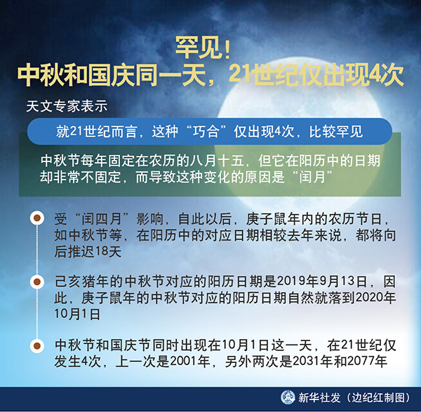 新華社天津9月19日電(記者周潤健)中秋節和國慶節將至,巧合的是,兩節同時出現在10月1日這一天。天文專家表示,就21世紀而言,這種“巧合”僅出現4次,比較罕見。