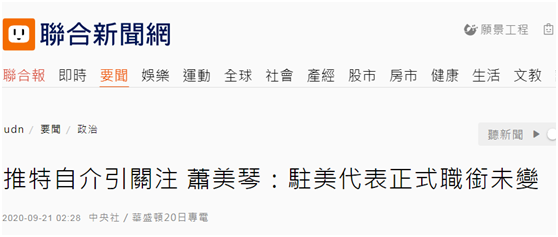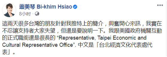 據台灣“聯合新聞網”報道,眼看事情鬧大了,蕭美琴昨(20日)晚11時37分在個人臉書上澄清,她與美國政府機關互動的正式職銜還是“Representative, Taipei Economic and Cultural Representative Office”,中文是“台北經濟文化代表處代表”。