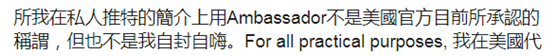 推特改名的台“駐美代表”深夜發文承認,“駐美大使”不是美國官方承認的稱謂